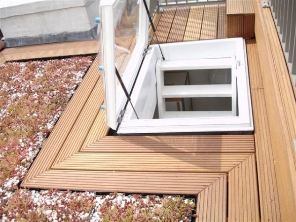 Een andere oplossing voor een daktoegang is een dakopbouw of dakhuisje. Een dakhuisje als daktoegang mag maximaal 6 m2 bedragen. De trap die geplaatst gaat worden om toegang tot het dakterras te krijgen komt in dit dak huisje uit. Deze daktoegang is een ideale oplossing om bergruimte te creëren voor opslag van kussens en tuinmeubelen in de winter. De dakhuisjes worden bij ons in de fabriek compleet geprefabriceerd, zodat ze in een halve dag geplaatst kunnen worden op het dakterras.